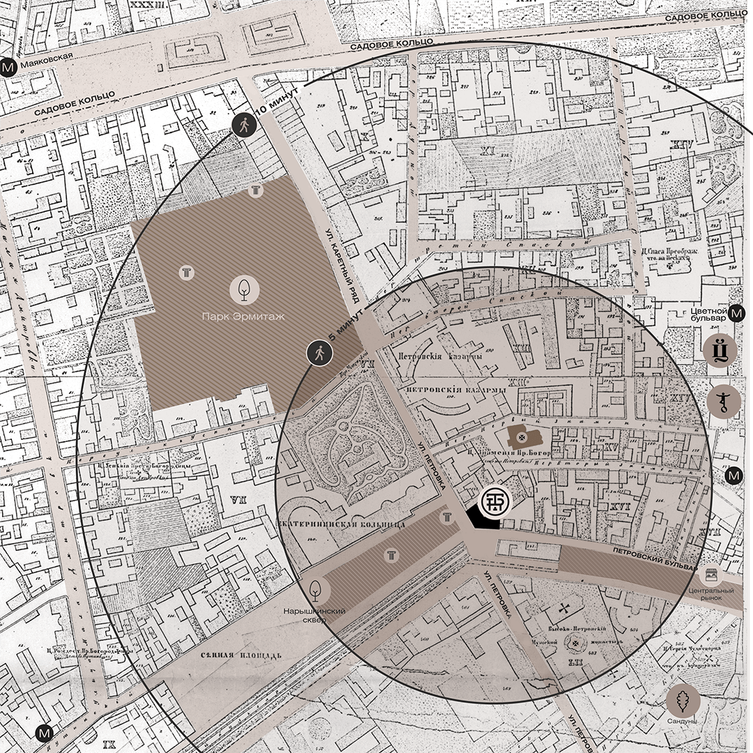 В километре расположен один из главных символов Москвы - Большой театр. Дорога к нему пролегает через улицу Петровка, минуя ЦУМ и Малый театр. Поблизости Театральная площадь и Площадь Революции, немногим дальше - Охотный ряд, культовые рестораны Белуга и Dr. Живаго, а также парк Зарядье.